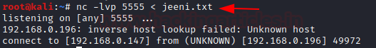 Here we are using Kali Linux as the attacker machine. To get the file, Netcat is used as a listener, and type this command,