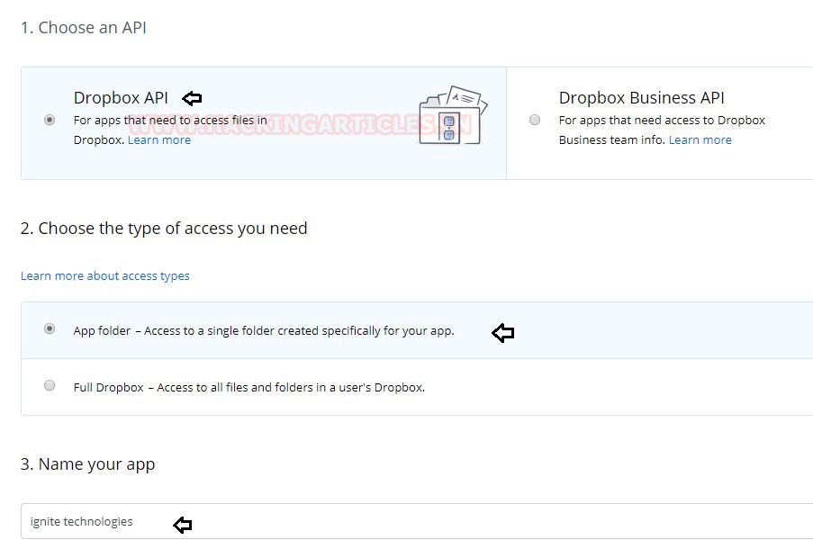To do that, this tool requires a Dropbox API. To get that, first, create an account on Dropbox. Then, after creating the account, head to developer tools here. A webpage will open similar to the one shown below. Here we will select the “Dropbox API”. Then, in the type of access section, we will choose “App folder”. Name the app as per your choice. Then click on the Create App Button to proceed.