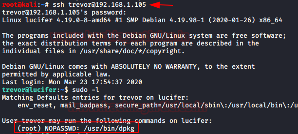 with the help of sudo list, we notice that trevor can execute dpkg program as root.