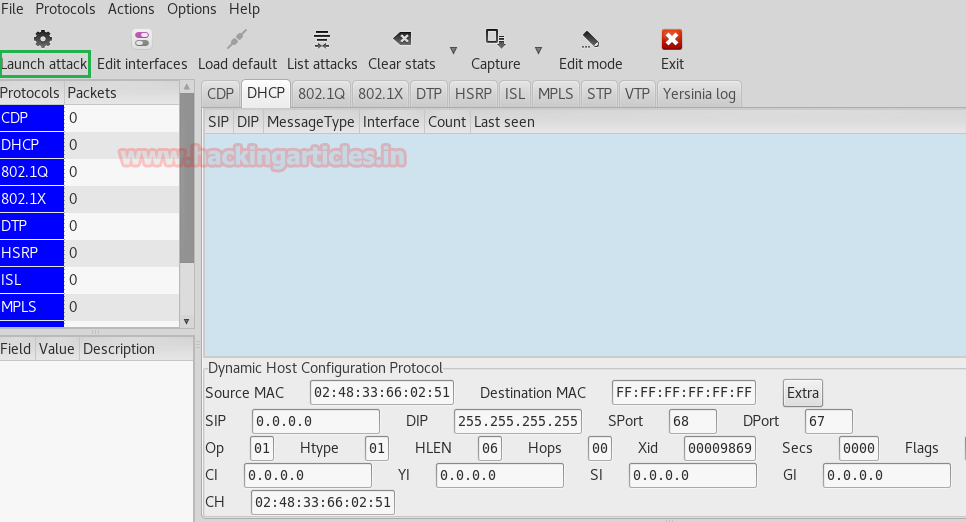 You will observe few tabs in the menu bar click on launch attack; a small window will pop up for choosing the protocol for attack here we had select DHCP, now enable the option for sending DISCOVER packet.