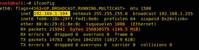in below image, you check attacker’s machine IP is 192.168.1.104 which will reflect as DNS address in victim’s machine (Windows’s).