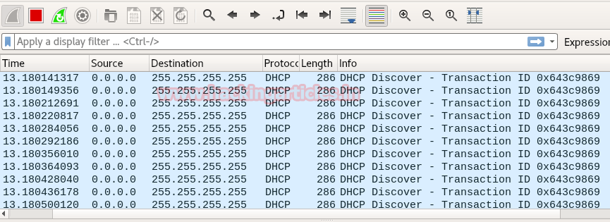 From given below image you can observe Wireshark has captured the DHCP packet where the attacker machine as source 0.0.0.0 is broadcasting DISCOVER message to Destination on 255.255.255.255. This is DHCP starvation attack which also considered as DHCP Dos attack because its send Discover message infinitely in the network to block the responded server for another genuine request from another DHCP client.