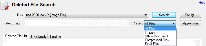 On preset drop-down select the file type we want to recover/search. Select all files if we need to have multiple file types as output.