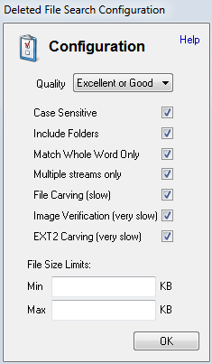 Click on the “Config” button and check/uncheck the options as required. Select the Quality from the drop-down (Please note better the quality more time it will take to process), for better result check the file carving option. We can also limit the file size we want to search for (this will omit the files that are not in the range to refine the search), Click Ok.