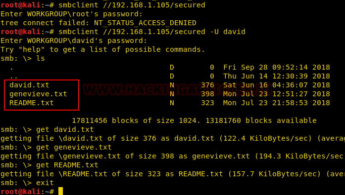 smbclient //192.168.1.105/secured -U David password: qwertyuioplkjhgfdsazxcvbnm get david.txt get genevieve.txt get README.txt