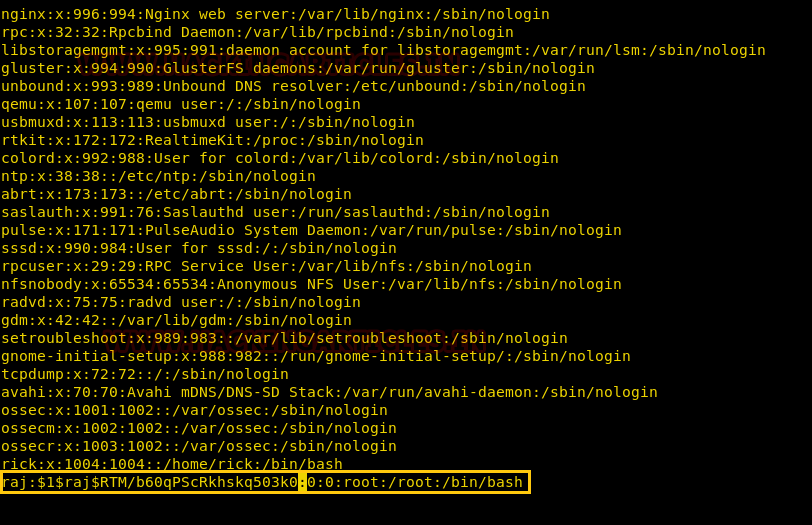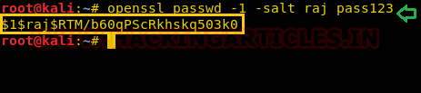 Suppose I would like to create a new user (raj) with root privilege inside /etc/password file of victim’s machine. So first we need to copy the content of /etc/passwd file in a text file inside our local machine and then with the help of OpenSSL generates the salt password for user raj and then copy the salt value.