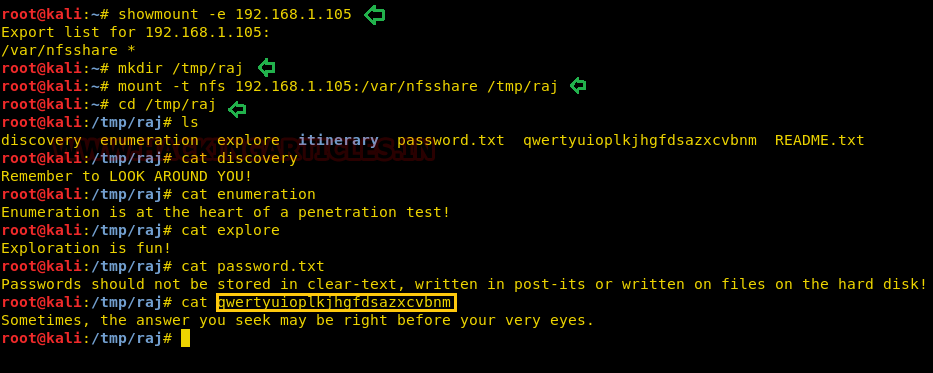 mkdir /tmp/raj mount -t nfs 192.168.1.105:/var/nfsshare /tmp/raj cd /tmp/raj ls cat discovery cat enumeration cat explore cat password.txt cat qwertyuioplkjhgfdsazxcvbnm