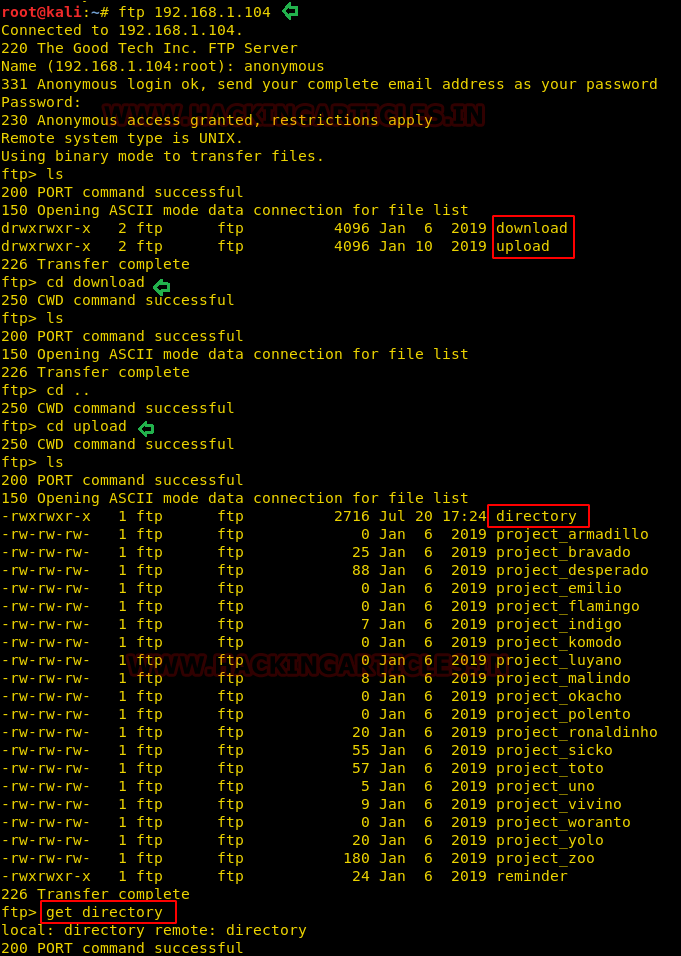 So, we connect to ftp where here I find two directories /download and /upload. The upload directory has read and write permission whereas the /download has read permission. So, we try to access /download directory and found a file within its named “directory”.