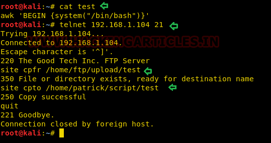 telnet 192.168.1.104 21 site cpfr /home/ftp/upload/test site cpto /home/patrick/script/test