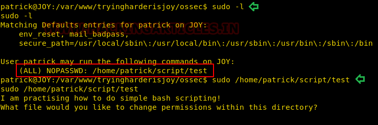 Without wasting time, we switch as Patrick and check for its sudo rights if assigned for him. Here we found that Patrick can run /home/patrick/script/test as sudo user. So, when we run the test script, it gave nothing useful as it was a demo to test working bash script thus the file “test” was useless but it own by root user which was doubtful for us.