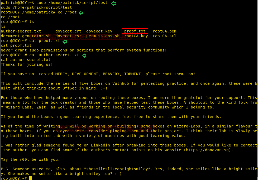 Hmmmmm!! so we have spawn root shell successfully, now let’s move inside /root directory and grab the proof.txt file and secret file.