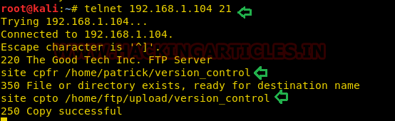 telnet 192.168.1.104 21 site cpfr /home/patrick/version_control site cpto /home/ftp/upload/version_control