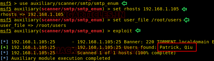 use auxiliary/scanner/smtp/smtp_enum set rhosts 192.168.1.105 set user_file /root/users exploit