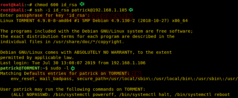 chmod 600 id_rsa ssh -i id_rsa patrick@192.168.1.105 sudo -l