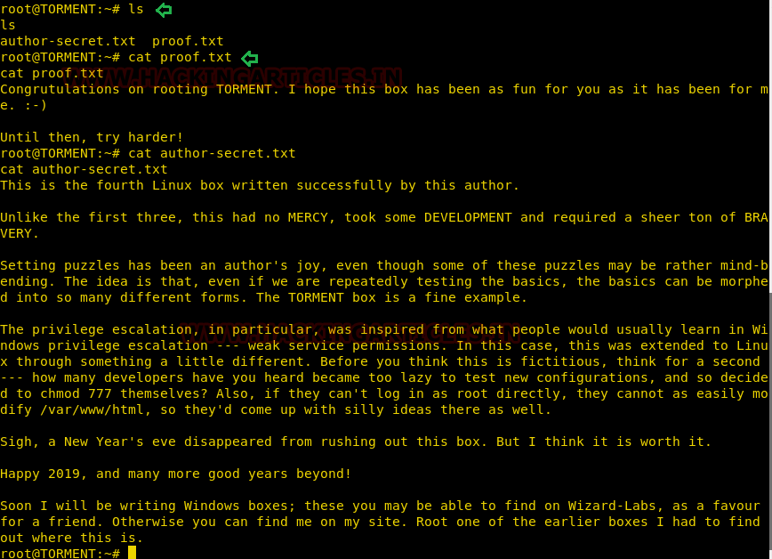 Once you have got the root shell get the root flag is like a cakewalk which we eventually did and got the two flags proof.txt and author-secret.txt.