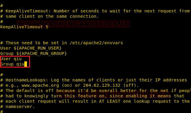 We added a user qiu and group qiu inside the /etc/apache2/apache2.conf so that we will leverage it for privilege escalation. So the idea is when we restart the apache service it will get executed with qiu user privileges.