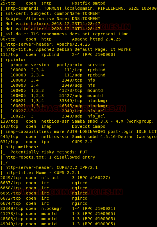 Other important ports open on the system are 25, 80, 445, 631, 2049 and 6667.