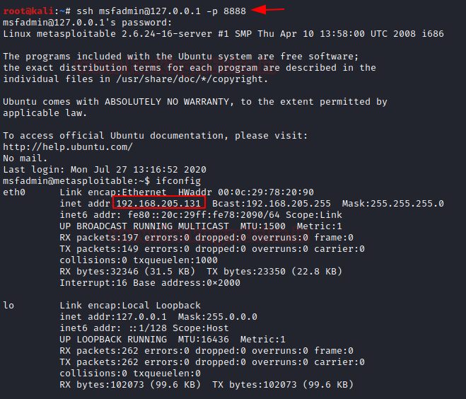 ssh msfadmin@127.0.0.1 -p 8888
