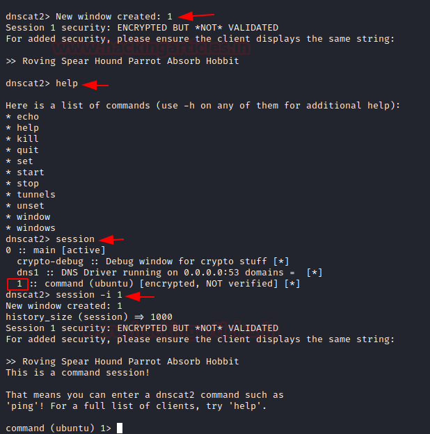 And finally, we see session established status in the window. When we refresh our server’s dnscat2 console, we see a new session is created. To interact with it we use the command: