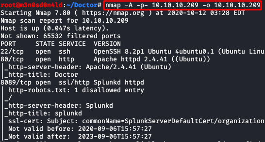 We will use the following commando to perform a scan to all ports with scripts and versions.