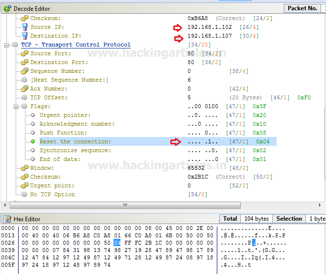 in the window are categories into three phases as Decode Editor, Hex Editor, and packet List. From the given image you can observe the following information which I had edited for TCP packet