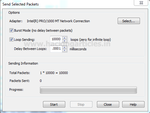 Then click on start to launch the TCP packet for DOS attack.