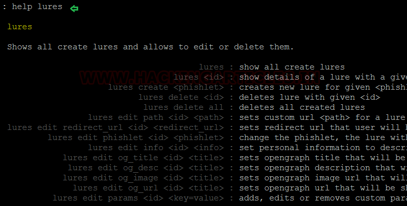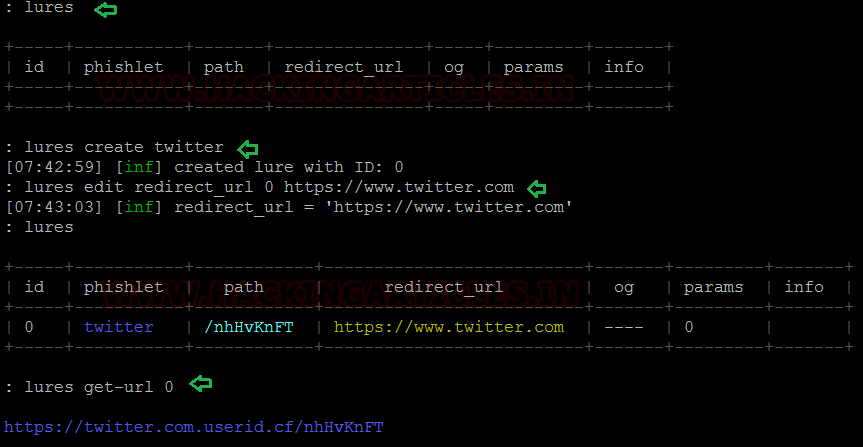 lures lures create twitter lures edit redirect_url 0 =’https://www.twitter.com’ lures lures get-url 0