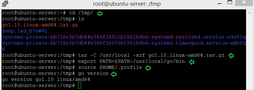 cd /tmp/ ls tar -C /use/local -xzf go1.10.linux-amd64.tar.gz export PATH=$PATH:/use/local/go/bin source $HOME/ .profile go version