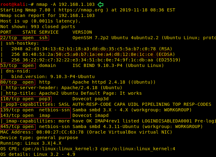 With the help of nmap, we observed that port number 22, 53, 80, 110, 139, 143, 445 are open with the services of SSH, DNS, HTTP, POP3, NETBIOS, IMAP and NETBIOS respectively.