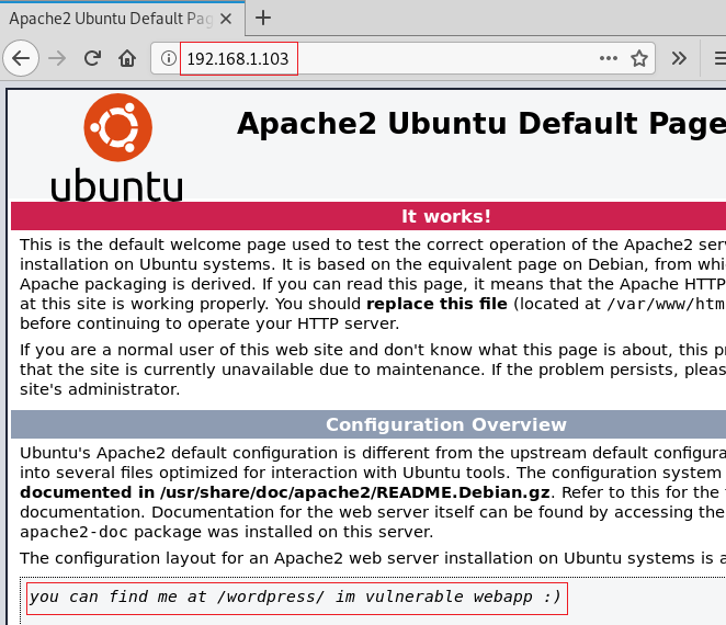 The apache webpage opens which is normal except for the fact that there was a comment saying “you can find me at /wordpress/ im vulnerable 😊 “