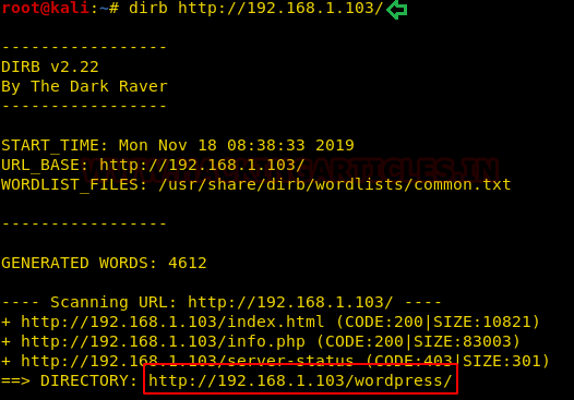 Now according to this comment, it means there is a vulnerable directory called ‘WordPress’. So to confirm we used dirb command which is: