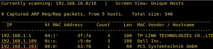 As you can see from the above image, our target IP is 192.168.1.103. Now that we know target IP, we can move on to scanning our target so that step by step we can attack further and gain control of the machine and scanning will help us to find an opening. We will scan with the help of nmap and for that use the following command: