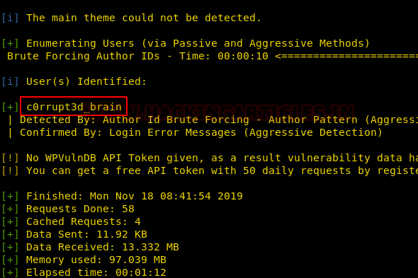 As you can see in the image below, there is a vulnerable plugin c0rrupt3d_brain where we can attack via bruteforce and get a password to log in.
