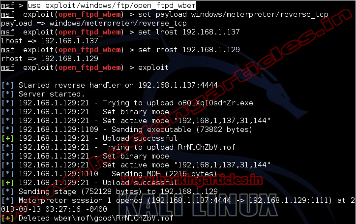 msf exploit (open_ftpd_wbem)>set rhost 192.168.1.129 (IP of Victim PC)