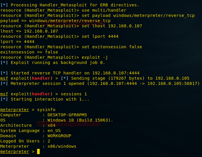 Go back to the Kali terminal and you will see Handler starting the reverse tcp and that’s it, you’ve done it. You now have a Meterpreter session, plain and simple.