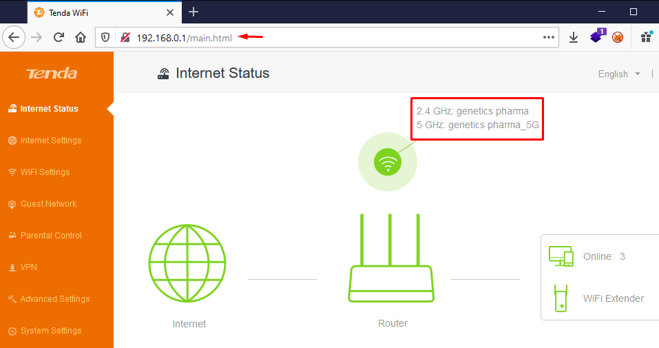 Navigating the Tenda AC1200 gateway IP i.e. 192.168.0.1 over at our browser, we got landed on the router’s main.html webpage. There we discovered that the Wi-Fi Names are displayed on the screen.