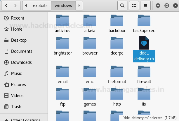 The code for the exploit has to be copied into Leafpad and saved with a “.rb” extension, you can name it anything you like, to avoid any confusion, ours is named “dde_delivery.rb”. This file has to now be moved into the windows section of the exploit folder in Metasploit, you can find the path and exploit URL below.